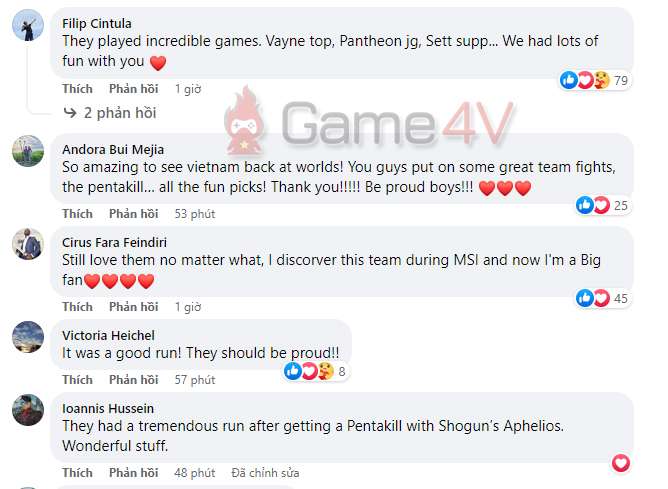 “Thật tuyệt vời khi thấy Việt Nam trở lại CKTG! Các bạn đã có những pha giao tranh rất tuyệt vời, và cả Penta Kill nữa… cùng một loạt các lựa chọn thú vị! Thank you nhé! Tự hào về các bạn! ”